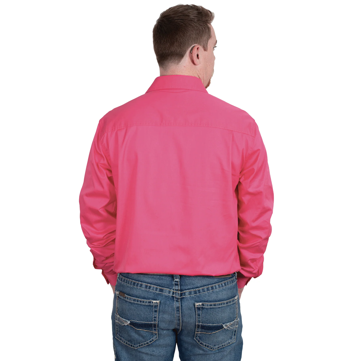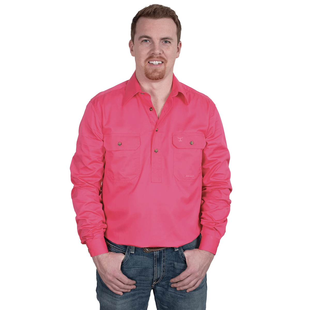 Long tails so shirts stay tucked-in, 100% Cotton, Double pockets, Long sleeve, Half button front, Twin needle stitching, Side pleats on back for ease of movement, Pen hole left pocket, Lightweight 150gsm