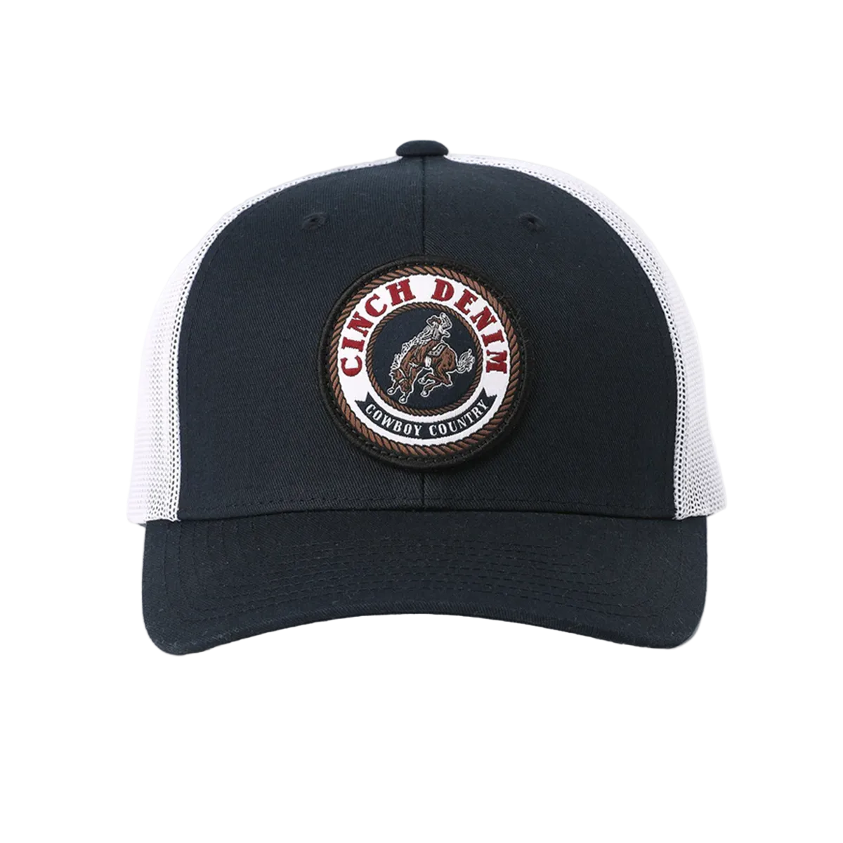Top off your ranch-bound look with this navy blue Flexfit trucker cap by CINCH. Designed with a mid-profile fit and 6-panel construction, it features a woven CINCH Denim logo patch up front and a secure back snap closure. Whether you’re working the ranch or kicking back on the weekend, this cap is made for everyday wear.