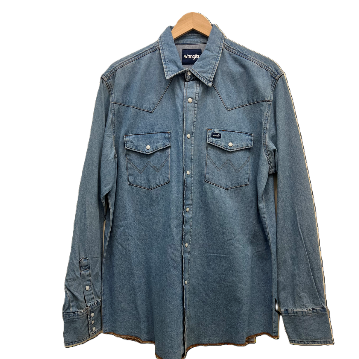 One wardrobe staple a cowboy should never be without is a work shirt that can hold its own. That's precisely why our Cowboy Cut® work shirt is designed with hard work in mind, so you can get any job done with total confidence. Every Cowboy Cut® work Western denim snap shirt comes with all the authentic details you'd expect from a tried-and-true Wrangler® essential, including Western front and back yokes, a spread collar, two spade flap snap pockets, the Wrangler® logo riser label on the left pocket, and our decorative 'W' stitching. Just like the jeans in our Cowboy Cut® collection, the Cowboy Cut® Western snap denim work shirt will keep you dressed and ready for anything.
