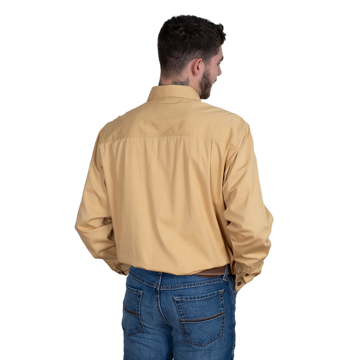 Long tails so shirts stay tucked-in, 100% Cotton, Double pockets, Long sleeve, Half button front, Twin needle stitching, Side pleats on back for ease of movement, Pen hole left pocket, Lightweight 150gsm