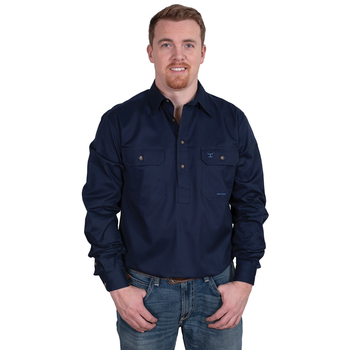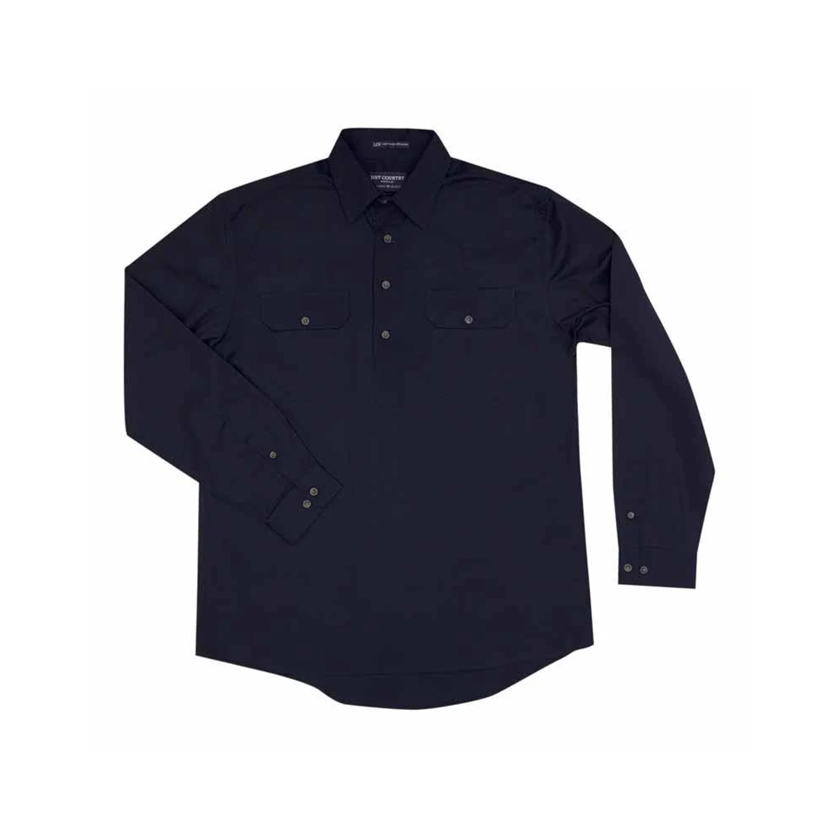 Long tails so shirts stay tucked-in, 100% Cotton, Double pockets, Long sleeve, Half button front, Twin needle stitching, Side pleats on back for ease of movement, Pen hole left pocket, Lightweight 150gsm